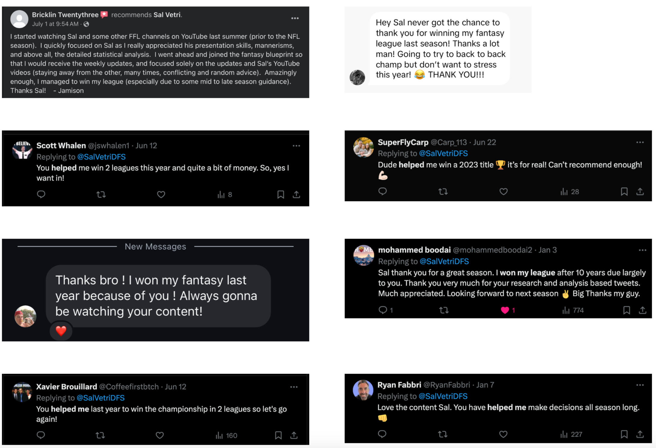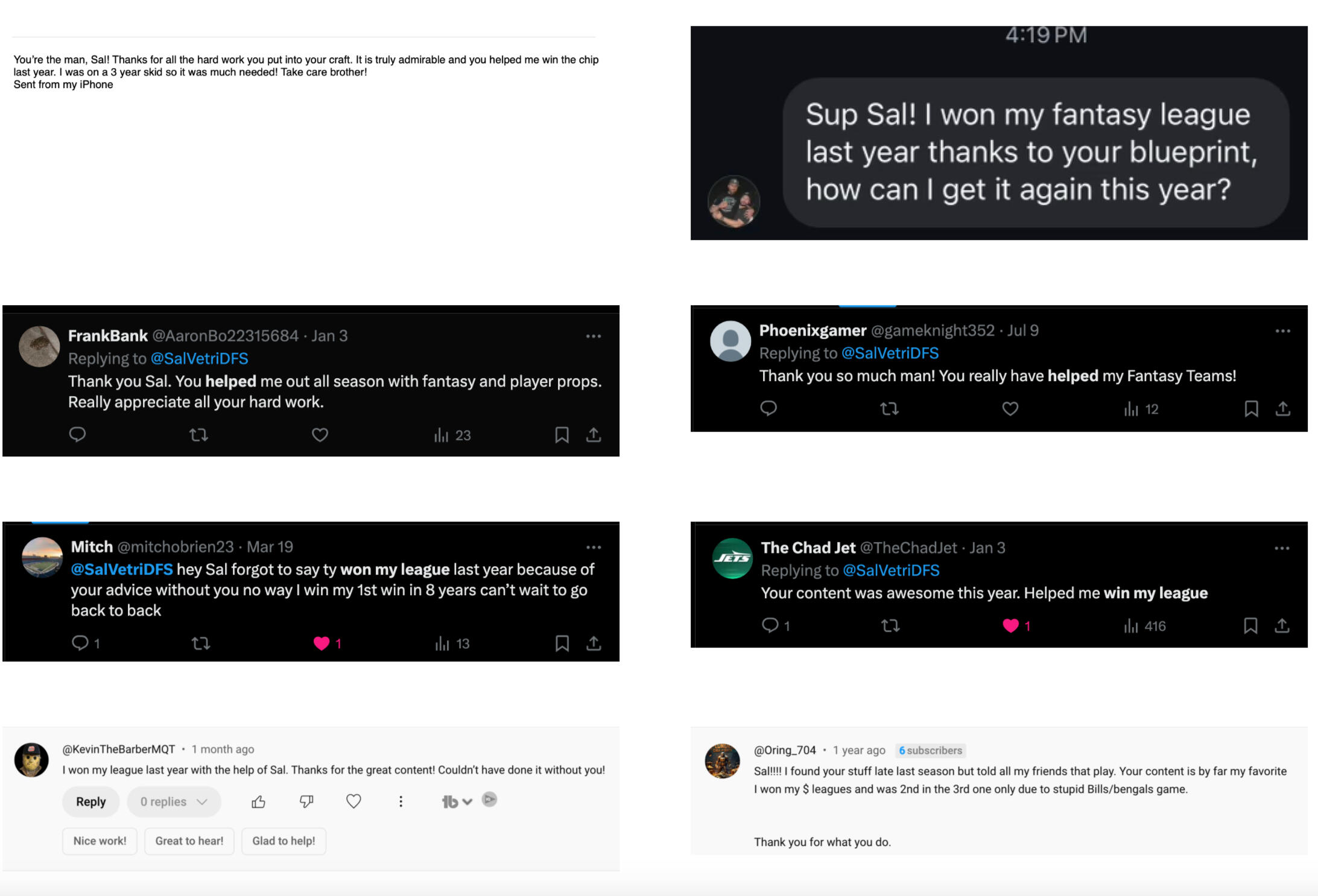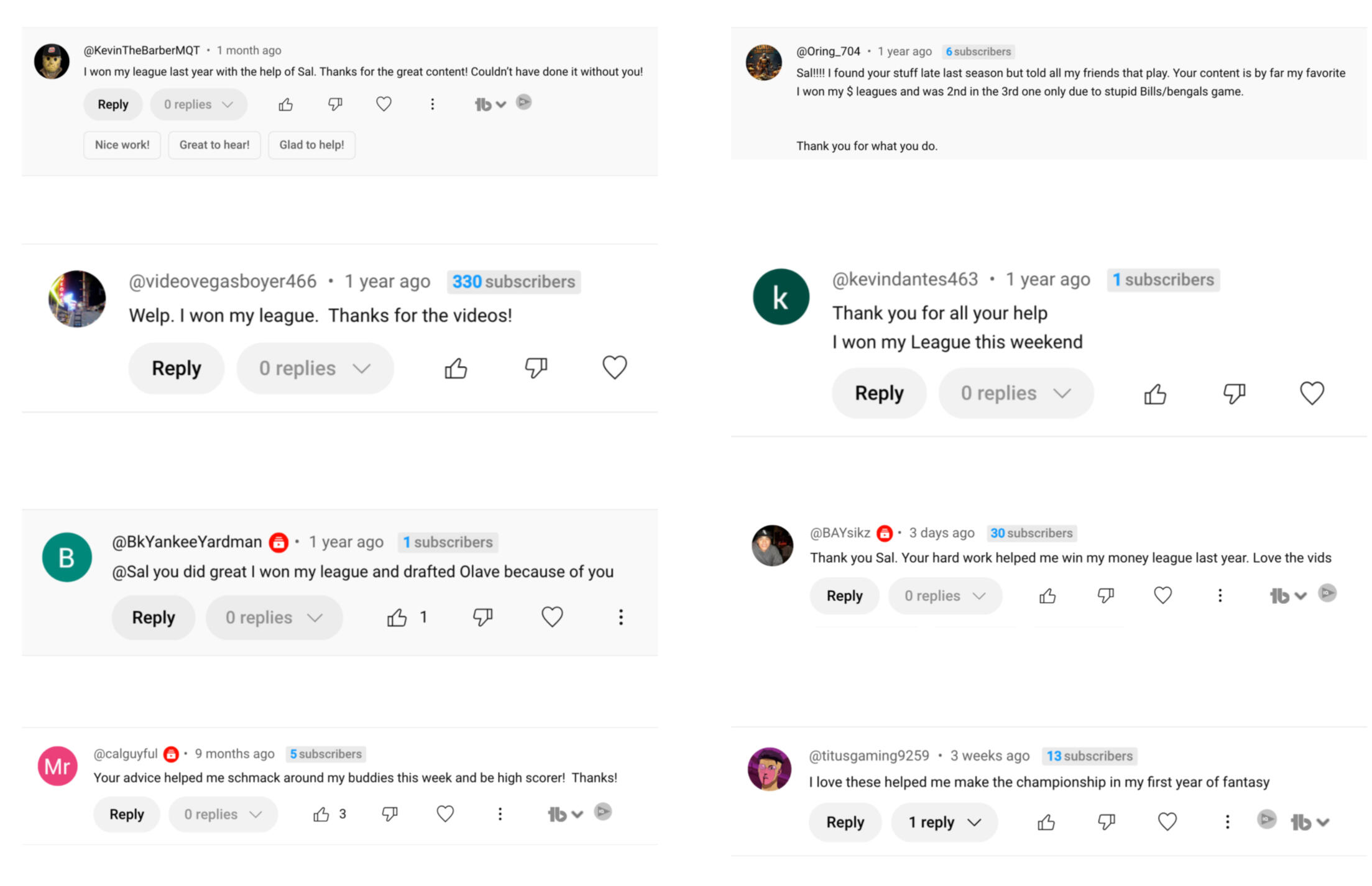 Will this work for me if I’m not a hardcore player?Yes—The Blueprint is designed to simplify the game. Whether you're a seasoned vet or a casual player, you'll get clear guidance every step of the way.Do I need this if I already follow Sal on YouTube or socials?Those are free, but The Blueprint is where Sal gives full rankings, tools, and support - the stuff that doesn’t fit on social.What if I don’t have time to keep up every day?That's the whole point - The Blueprint helps you make confident moves in just minutes per week.Is this for season-long or DFS?Both. The Blueprint covers season-long strategy, and Blueprint+ unlocks DFS and prop betting tools too.What happens after I join?You get instant access to rankings, tools, and a full onboarding guide. If you choose Blueprint+, you also get Discord access and DFS tools.Can I cancel anytime?Yes - no contracts, no hassle. You can cancel monthly at any time or upgrade to annual to save big.What if I already think I'm pretty good at fantasy?Perfect. The Blueprint is built to give you that 5% edge that separates playoff teams from champions.